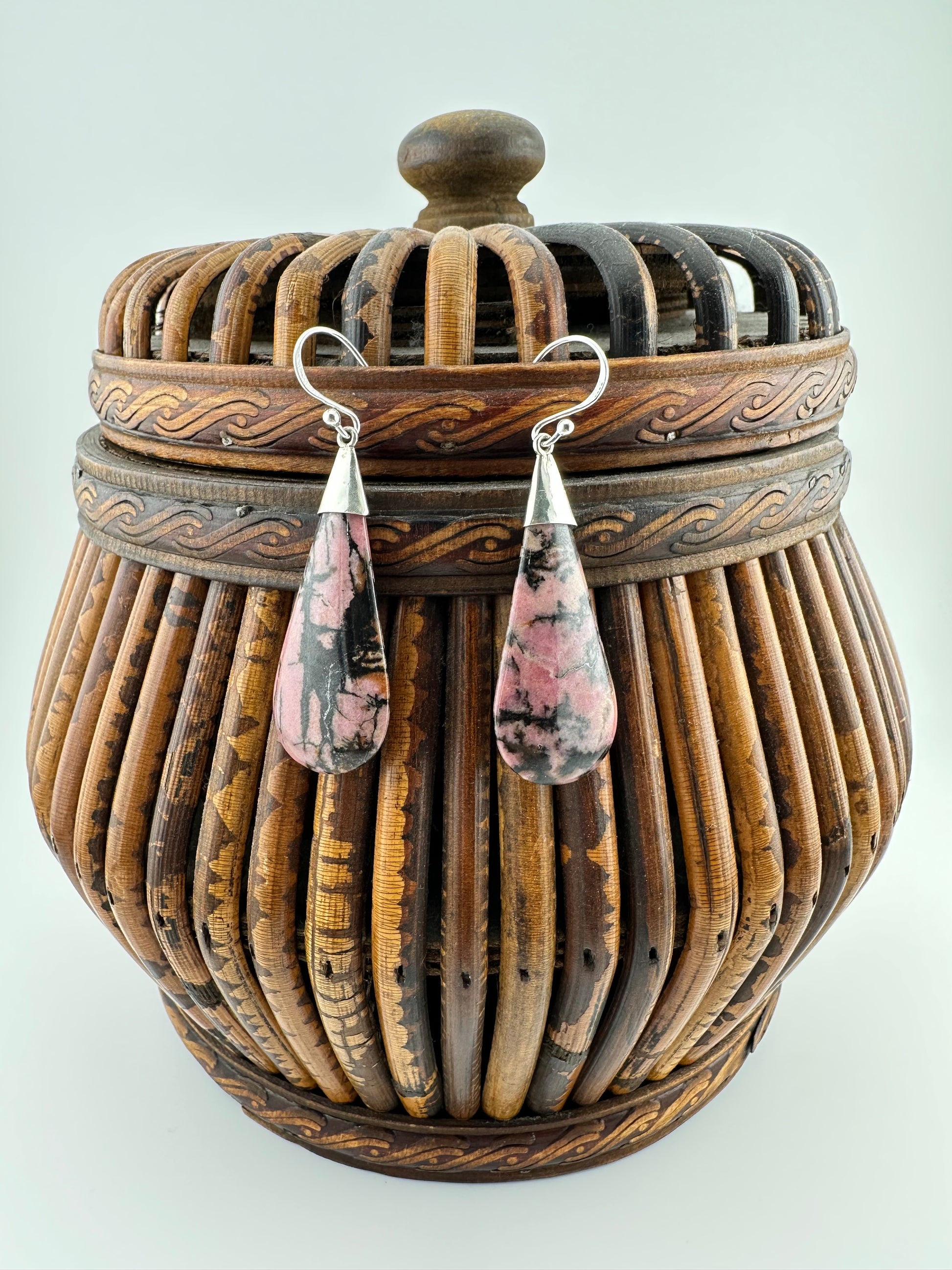 Introducing our pink panther rhodonite earrings. These sophisticated and unique earrings are a must-have for any jewelry collection. Made with high-quality rhodonite and elegant 925 silver hooks, they add a touch of glamour to any outfit. Upgrade your style.