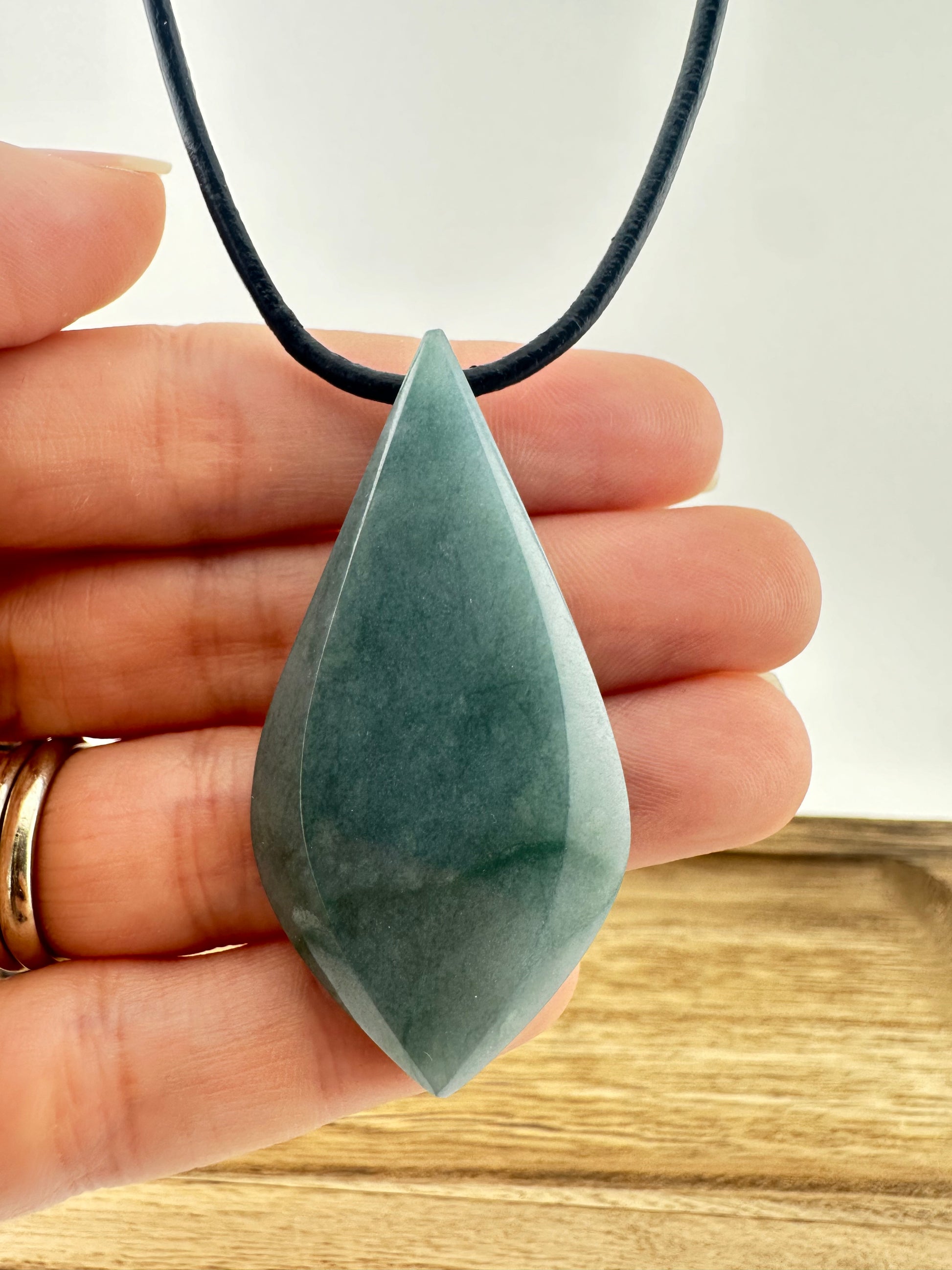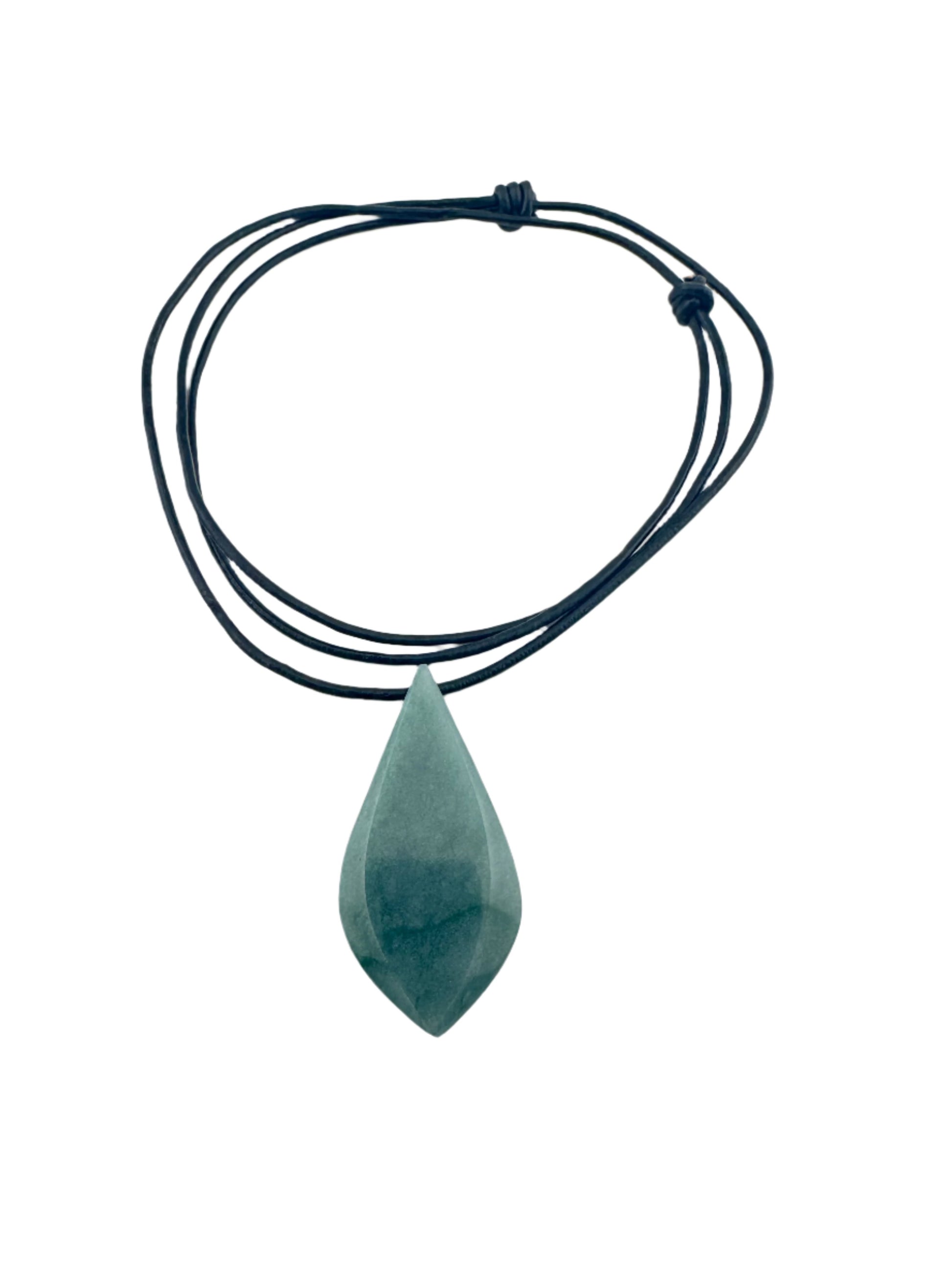 Grayed blue and green Jade tear pendant with leather necklace