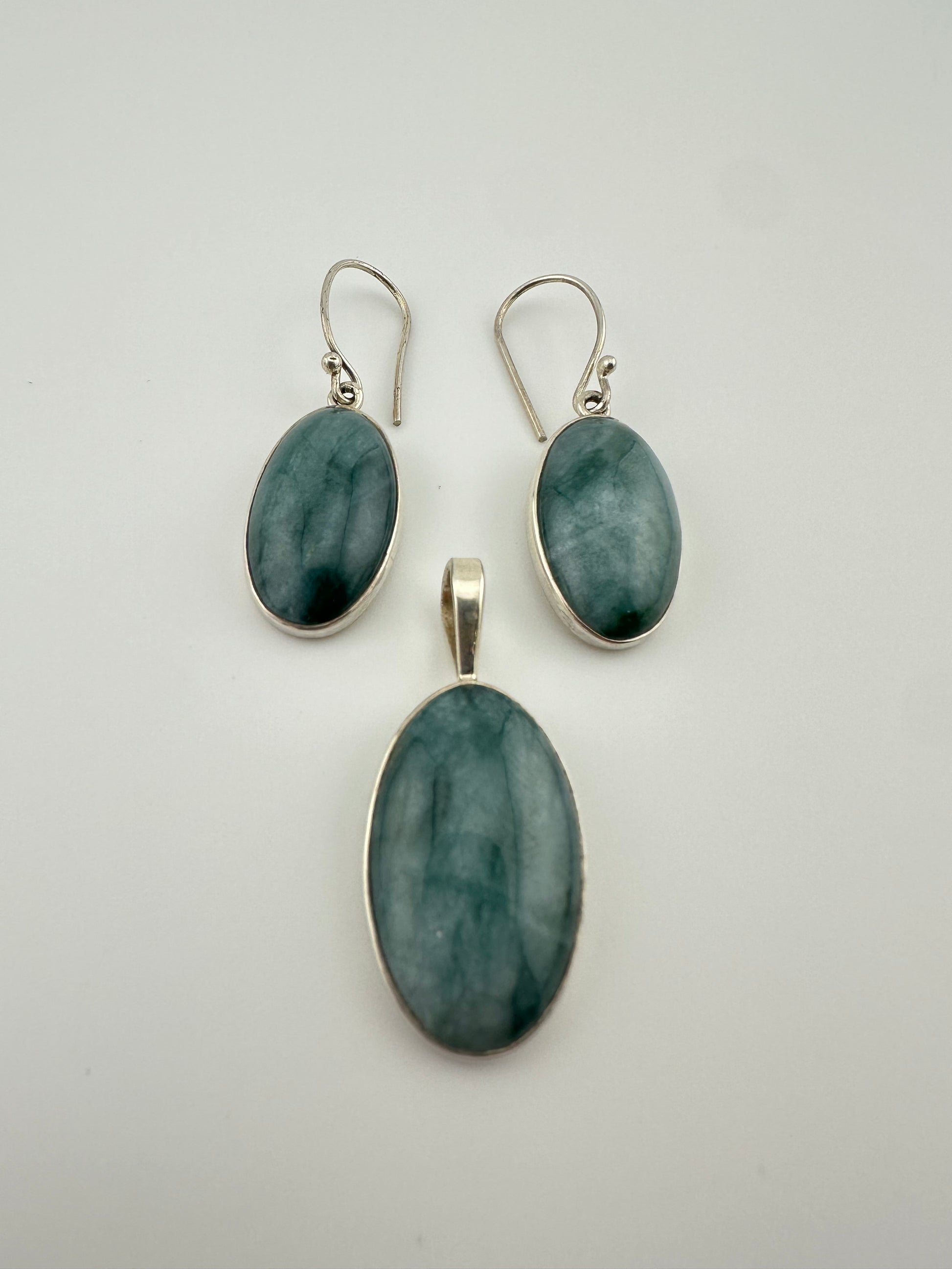 Add a touch of unique style to your look with our grayed blue Jade earrings and pendant oval set! Perfect for any occasion, this versatile set is sure to make a statement. Don't be afraid to be bold with these gorgeous pieces.